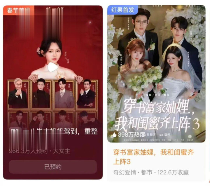 一早便高调宣布全面加码今年春节档的红果短剧,不仅在内容排播上下足了功夫,将《穿书富家妯娌,我和闺蜜齐上阵3》《十八岁太奶奶驾到,重整家族荣耀4》两部自带高受众黏性、贴合合家欢氛围的头部系列IP,安排在春节氛围最浓郁的时段,还通过增设与“推荐”并列的“春节”一级入口、推出集卡赢现金活动以及剧组主创专属直播等,在站内运营与用户互动上同步发力。