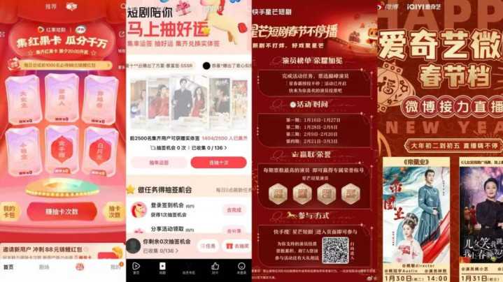 总体来看,从内容排播到互动玩法,从流量承接至用户留存,红果短剧、腾讯视频与快手均祭出了一套完整且精准的运营组合拳。而爱奇艺虽布局节奏相对克制,也针对性推出了“爱奇艺微剧新春礼福集”活动,并邀请30余位微剧演员,在大年初二至初五开启微博直播接力。