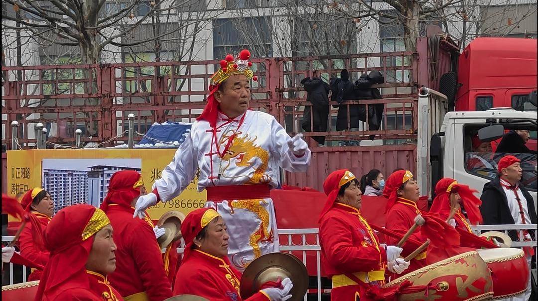 “微雨众卉新,一雷惊蛰始”。3月2日,淄博市周村区“元启新岁·丙午纳福”2026年元宵节民俗展演热闹启幕。来自淄博文昌湖省级旅游度假区商家镇的120余人的商家大鼓队身着大红队服,在“扮玩”队伍中格外显眼。商家大鼓非遗代表性项目代表性传承人蒋效利站在队伍中心作“鼓头”指挥,震天鼓点敲醒新春生机。